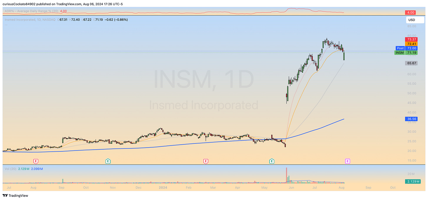 …but gapped down and stopped me out the next day. Saved me a lot of stress though. INSM would gap down big the next day with the rest of the market. Yes, with the benefit of hindsight, we can see it rallied hard on the open Monday but good luck holding through that gap down.