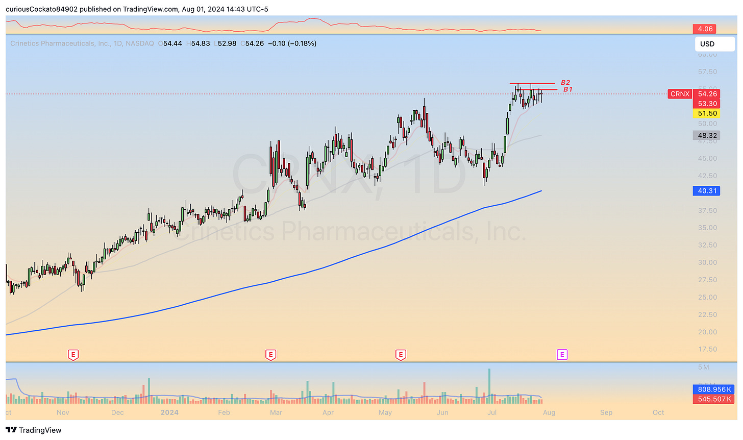 B1 (Buy 1) would be above the 7/29 high at 54.83. This is cheating a little bit and was probably early. Also the reason I was starting with only a 6.5% position.